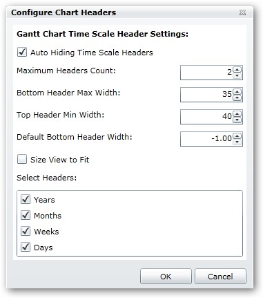 Use the built in GanttTimeScaleHeaderSettingsUI UserControl to create a dialog that will allow the end-user to configure the Gantt Chart time lines during runtime.