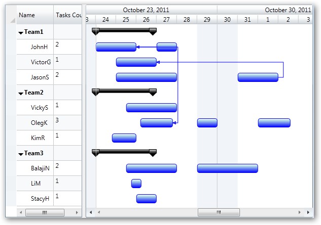 Then in XAML you can specify these bindings to let the gantt automatically figure out the relationships and render the dependency lines: