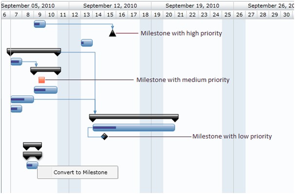 The TaskColorsBinding property in the GanttControl discussed earlier can also be used to customize the look and feel of a Milestone type task (with Effort = 0).
