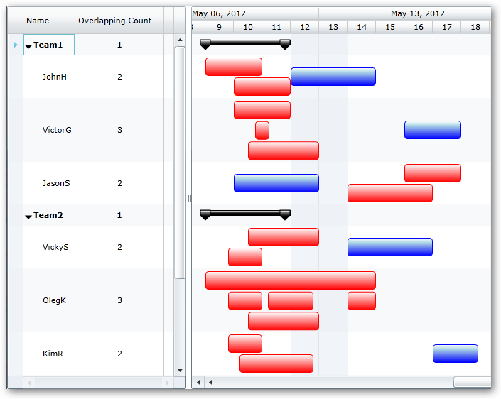 Another very useful feature available in FlexyGantt is the ability to bind the height of a row to the overlapped state of the tasks in that row. This is possible because the gantt keeps the MaxOverlappingBlocksRowCount value for each row (in FlexyNodeData instance) up to date with the maximum number of overlapping bars within the different blocks in each row. And binding to this property in the RowHeightBinding will give you the desired effect.