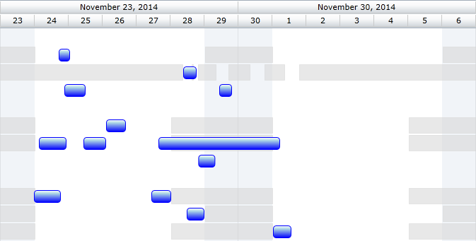 For example, in the sample referenced below the resources corresponding to each row have a custom schedule representing their "non-working" hours and this is represented using gray rectangles.