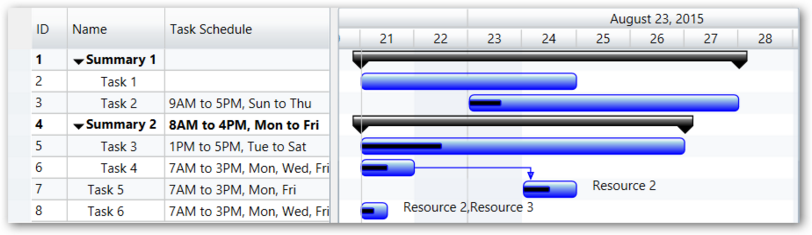 new CustomTask { TaskName = "Summary 2", ScheduleDesc="8AM to 4PM, Mon to Fri", Schedule = "mon 08:00:00 16:00:00; tue 08:00:00 16:00:00; wed 08:00:00 16:00:00; thu 08:00:00 16:00:00; fri 08:00:00 16:00:00;",TaskID = "12",SortOrder=4, StartTime = TimeComputingUtils.ToUtcKind(DateTime.Today),AssignedResources="Resource 1 , Resource 2",RequiredEffort = TimeSpan.Parse("08:00:00"), CompletedEffort=TimeSpan.Parse("2:00:00"), Description = "Description of Task 3/Child Task 1"},