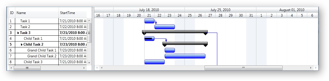 As seen above the default headers consist of a header row of type "Days" and another of type "Weeks". This is the default definition in the GanttControl.TimeScaleHeaders property.
