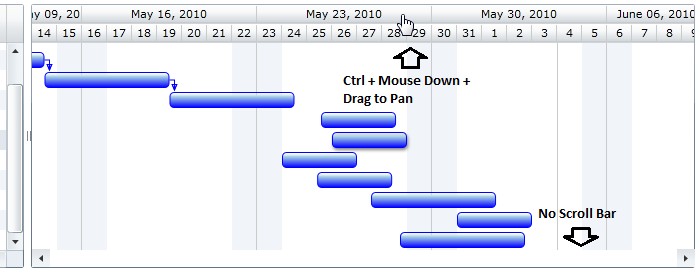 Alternatively, you could use the GanttChart.ResizeToFit property to make the view to resize to fit the available space. In this mode, the end-user can also easily pan the view thought a Ctrl + Mouse Down + Drag on the chart headers.
