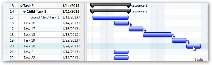 To visualize better the fully dependency tree hierarchy, you can choose to highlight the full tree when the end user hovers over a dependency line or a task in a dependency tree. You can do so with this code: