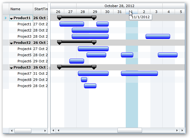 The gantt provides the option to highlight the time line in the chart area when the user moves the mouse over the time line headers. This feature is easily turned on with this setting: